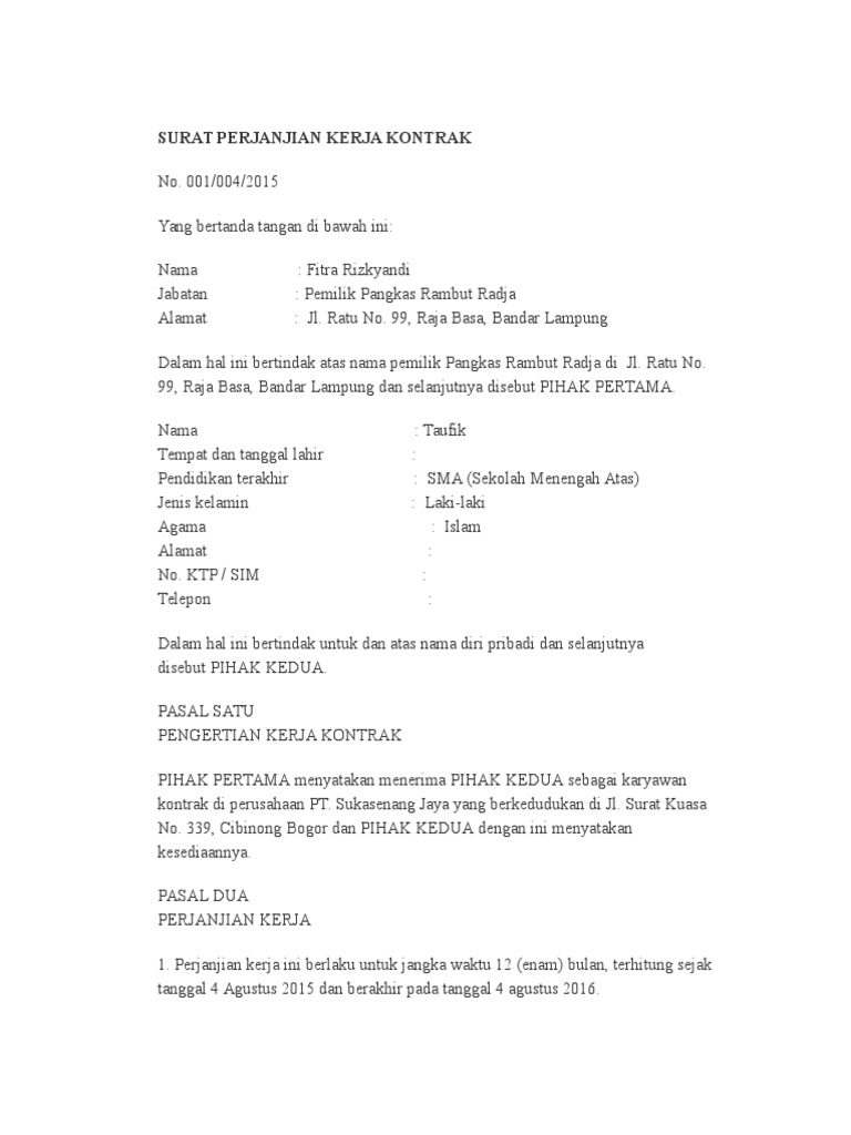 Kontrak atau perjanjian kerja didefinisikan sebagai perjanjian antara karyawan dengan pengusaha pada dasarnya, sebuah kontrak kerja mengatur hak dan kewajiban yang dimiliki karyawan dan. Surat kontrak kerja adalah surat yang berisi perjanjian yang saling mengikat dalam masa tertentu antara 4.1 contoh surat kontrak masa uji coba. Kontrak kerja yang tertulis hitam di atas putih adalah hal yang sangat penting, khususnya di dunia sehingga anda perlu memerhatikannya dengan teliti mengenai kontrak kerja karyawan yang ingin. Surat kontrak kerja ini penting hukumnya, demi kelancaran hubungan antara perusahaan dan karyawan. Karyawan kontrak merupakan karyawan yang memiliki perjanjian kerja waktu tertentu (pkwt) dengan pihak perusahaan.